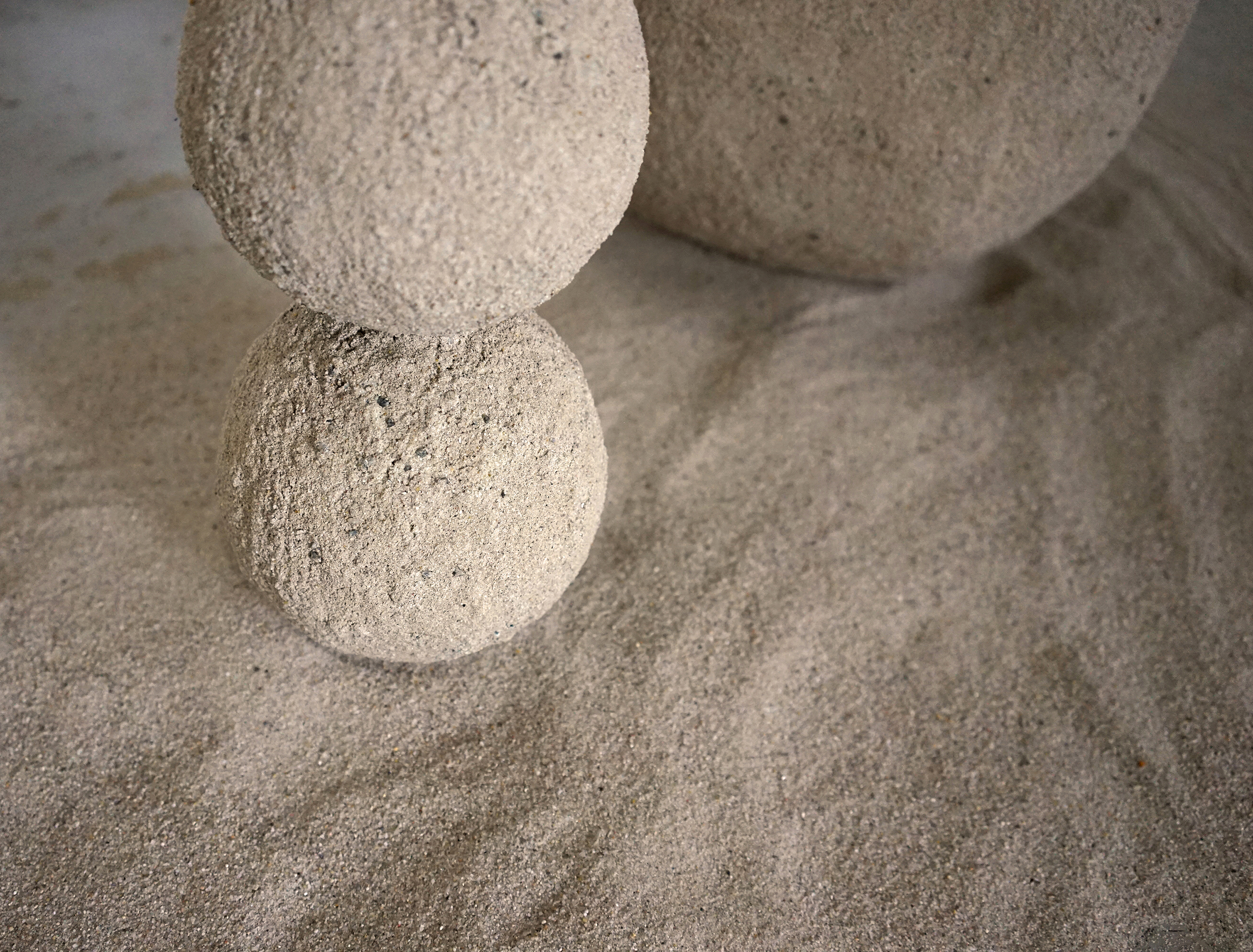 Sculpture/installation, 60 x 15 x 15 - 50 x 45 x 33 cm, material: sand, acrylic paint, glass, foam plastic, glue. 2020
